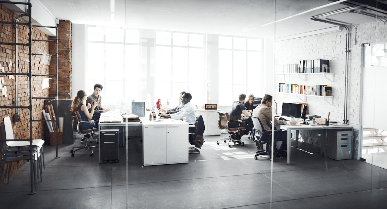 Team working collaboratively in open plan office, demonstrating connected teams using mind mapping, online chat and agile project management
